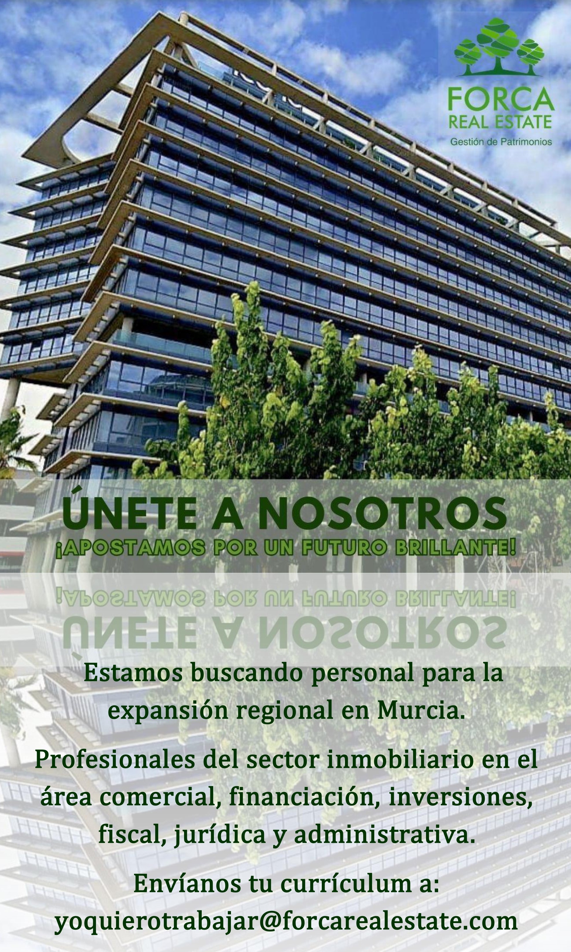 Únete a nuestra consultoría inmobiliaria en Murcia y Madrid. En Forca Real Estate, creemos en el potencial de cada individuo y ofrecemos un ambiente de trabajo dinámico y colaborativo donde puedes crecer y prosperar.